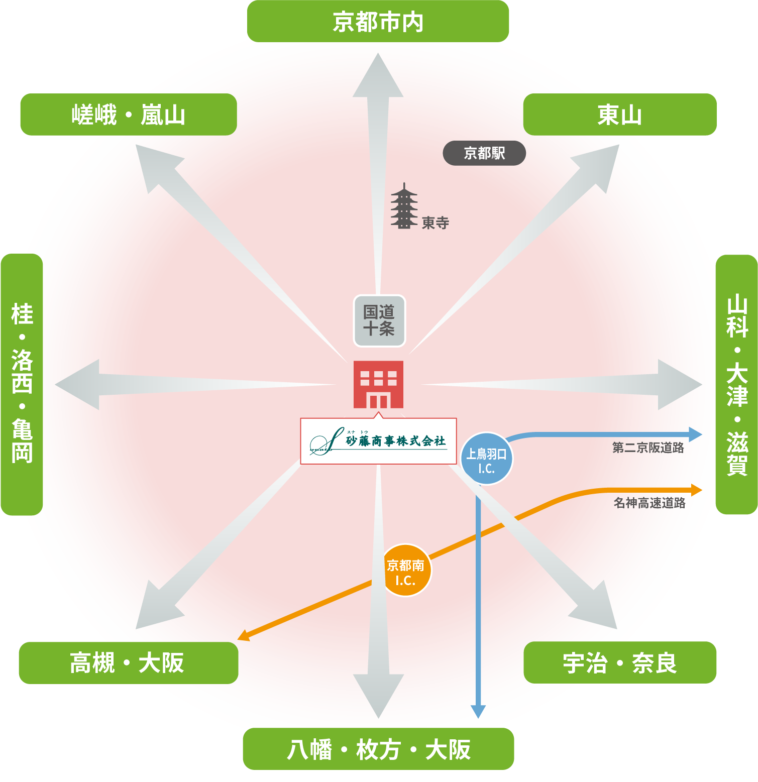 東西南北へと大きな導線が交わる場所で、京都市内、大阪、宇治、奈良方面、洛西・亀岡方面と、どの方向へもすばやく向かえます。